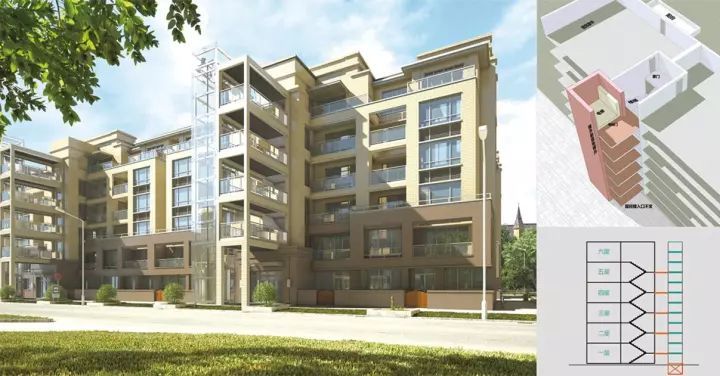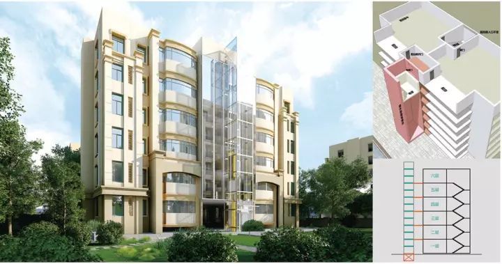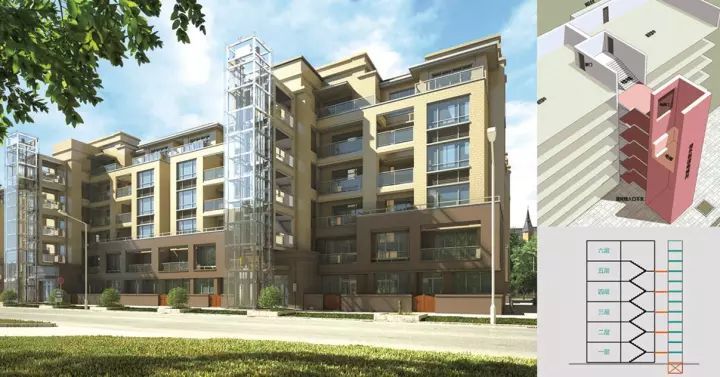 樓梯轉(zhuǎn)角處上下打通并重新改造成旋轉(zhuǎn)樓梯銜接上下層樓梯,電梯轎廂設置在室內(nèi)休息平臺空間,直接到達目的樓層。