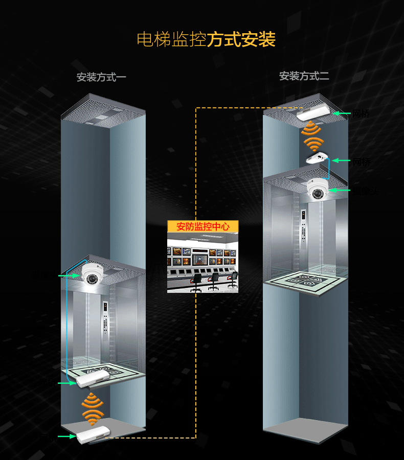 電梯內(nèi)底部已全部封閉,無法使用就近光纖節(jié)點對電梯視頻數(shù)據(jù)做傳輸,而電梯頂部留有電梯線纜口。這種情況下利用電梯轎廂與頂部的空隙空間,在電梯轎廂頂部安裝1臺專用無線網(wǎng)橋與電梯線纜口安裝的1臺電梯專用無線網(wǎng)橋進(jìn)行數(shù)據(jù)傳輸,通過網(wǎng)線使用交換機(jī)把各電梯的視頻數(shù)據(jù)集中,最后通過豎井使用網(wǎng)線或者在樓層頂!使用一對電梯專用網(wǎng)橋,把集中的視頻數(shù)據(jù)傳回機(jī)房,通過硬盤錄像機(jī)在大屏上顯示,整套方案,安裝簡單,施工工期短,便于后期問題的排查,維護(hù)。